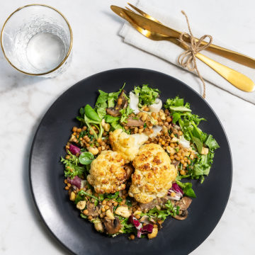 Ugnsbakad blomkål på en bädd av linser, svampfräs och crunchiga nötter - en underbart fräsch och festlig middag som enkelt kan anpassas i storlek och även serveras som förrätt!