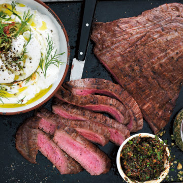 April 29, 2022Flankstek med gremolata och hasselnötter och yoghurt med mozzarella, dill och chiligurka