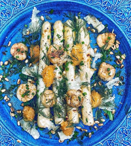 April 28, 2022Vit Sparris med halstrade pilgrimsmusslor, löjrom, brynt smör, parmesan och pinjenötter