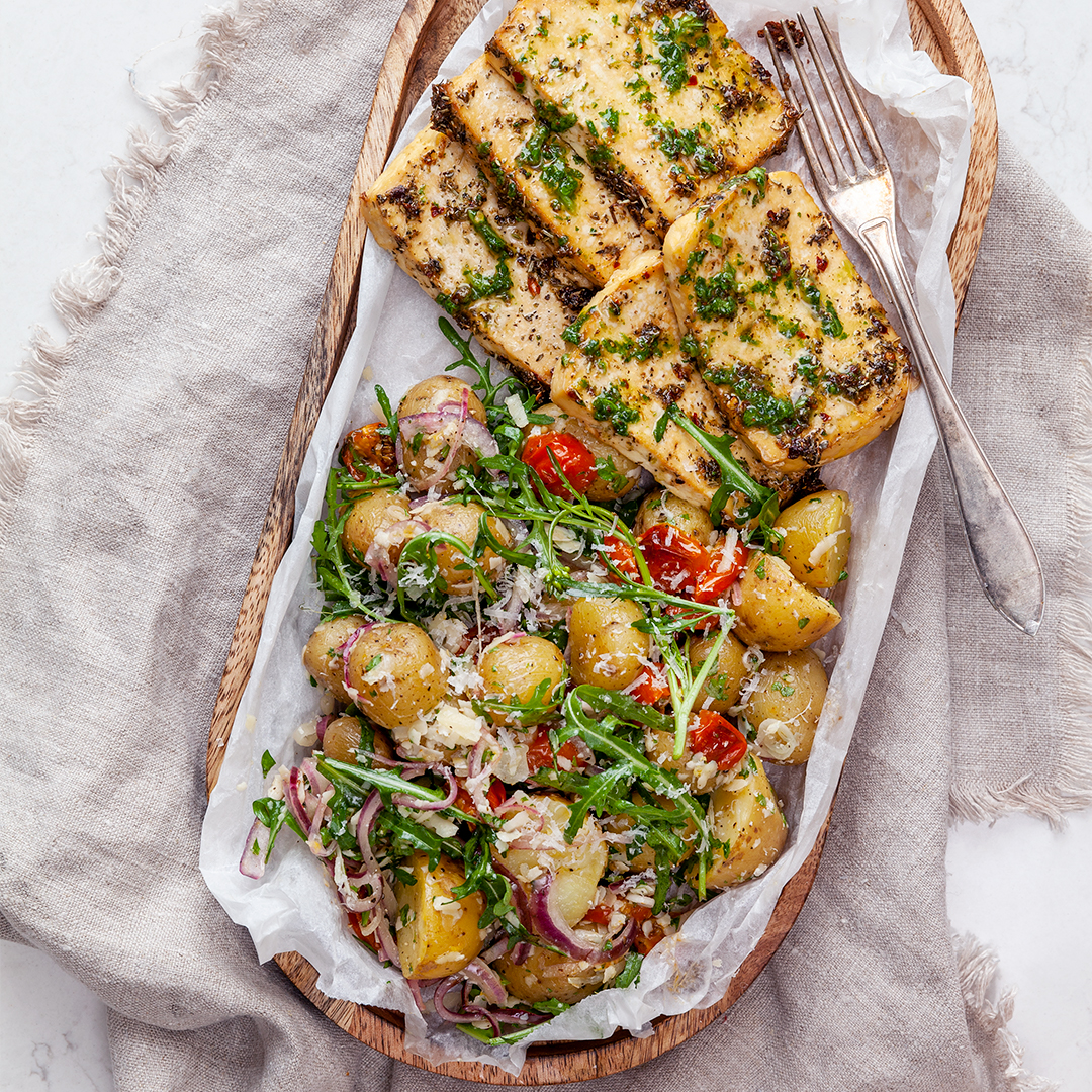 Ljuvlig vegetarisk middag med grillad tofu som serveras med örtig gremolata och potatissallad med italienska smaker.