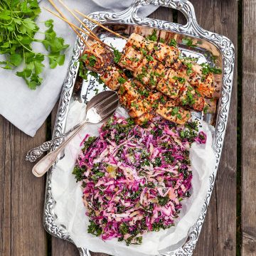April 29, 2022Grillade lammfärsspett med rostad färskpotatis och melonsallad