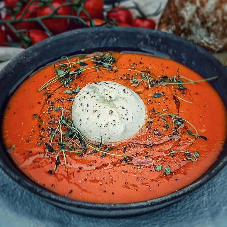 May 2, 2022Tomatsoppa på färska tomater med burrata, olivolja och timjan