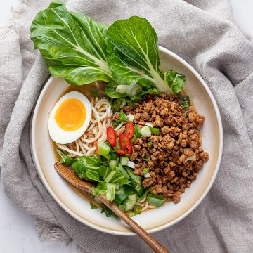 En vegetarisk version av den japanska buljongsoppan tantanmen ramen. Soppan är full av godsaker såsom äggnudlar, smakrik sojafärs, salladslök och pak choi.