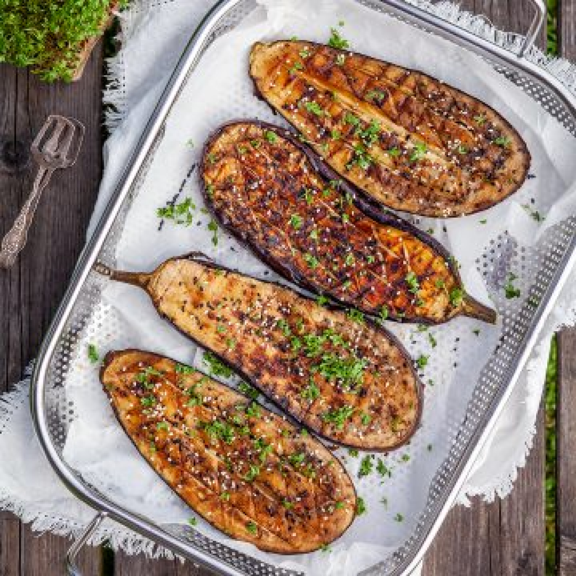 June 8, 2022Grillad aubergine med sesam och krasse