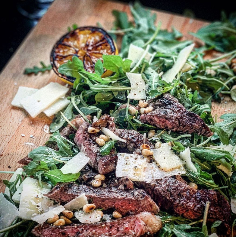 Tagliata di manzo med parmesan, pinjenötter & ruccola - en snabblagad och trevlig middag på ett fat