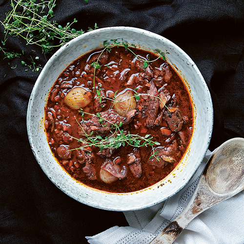 Klassisk husmanskost från Frankrike. En riktigt smakrik och mustig gryta med champinjoner och smålök. Ska puttra länge på spisen och fylla köket med ljuvliga dofter.