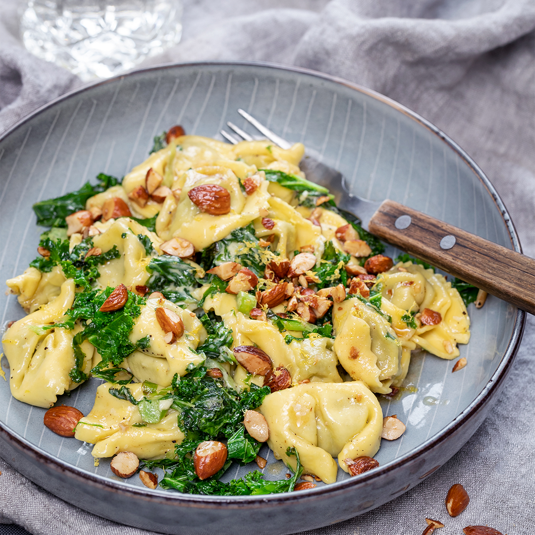 Underbart lättlagad huvudrätt med krämig tortellini, fräst grönkål och hackade mandlar. Till denna rätt behöver du bara köpa hem fem huvudingredienser!