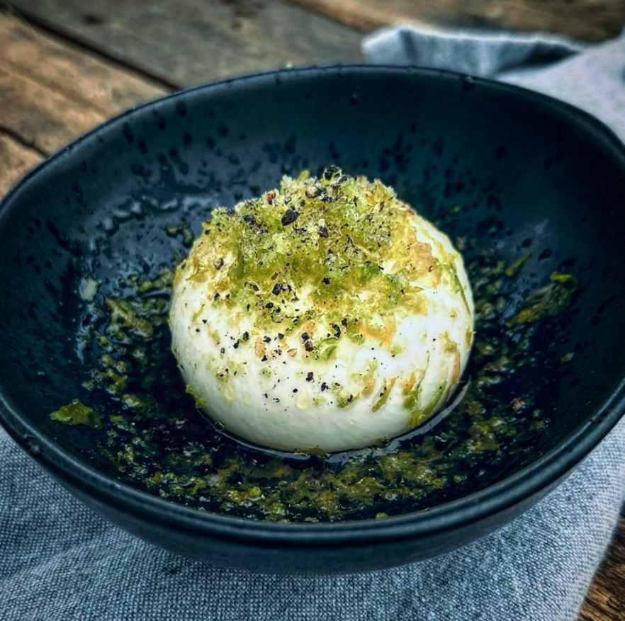 February 21, 2024Burrata med riven fryst grön tomat