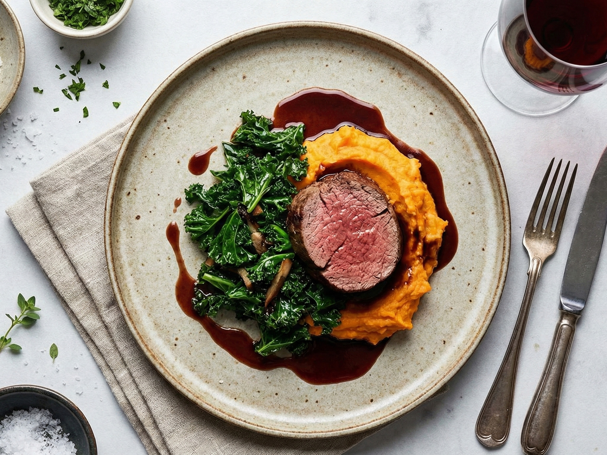 Njut av en perfekt stekt oxfilé med silkeslen sötpotatispuré, fyllig rödvinsås och krispig rostad grönkål. En lyxig middag där hantverket vid spisen ger maximal smak och en oslagbar kombination av texturer.