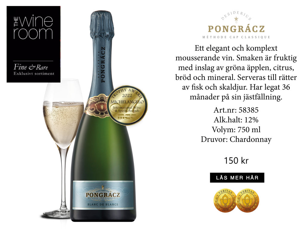 Premiärlansering av Pongrácz blanc de blancs, lyxiga bubblor från Sydafrika. Pongrácz Blanc de Blancs är ett mousserande vin från Sydafrika framställd enligt méthode cap classique, ett vin framställt till 100% av champagedruvan chardonnay vilket gör vinet till en “Blanc de Blancs”. Vinet har en mycket elegant smak, här hittar du inslag av äpplen,