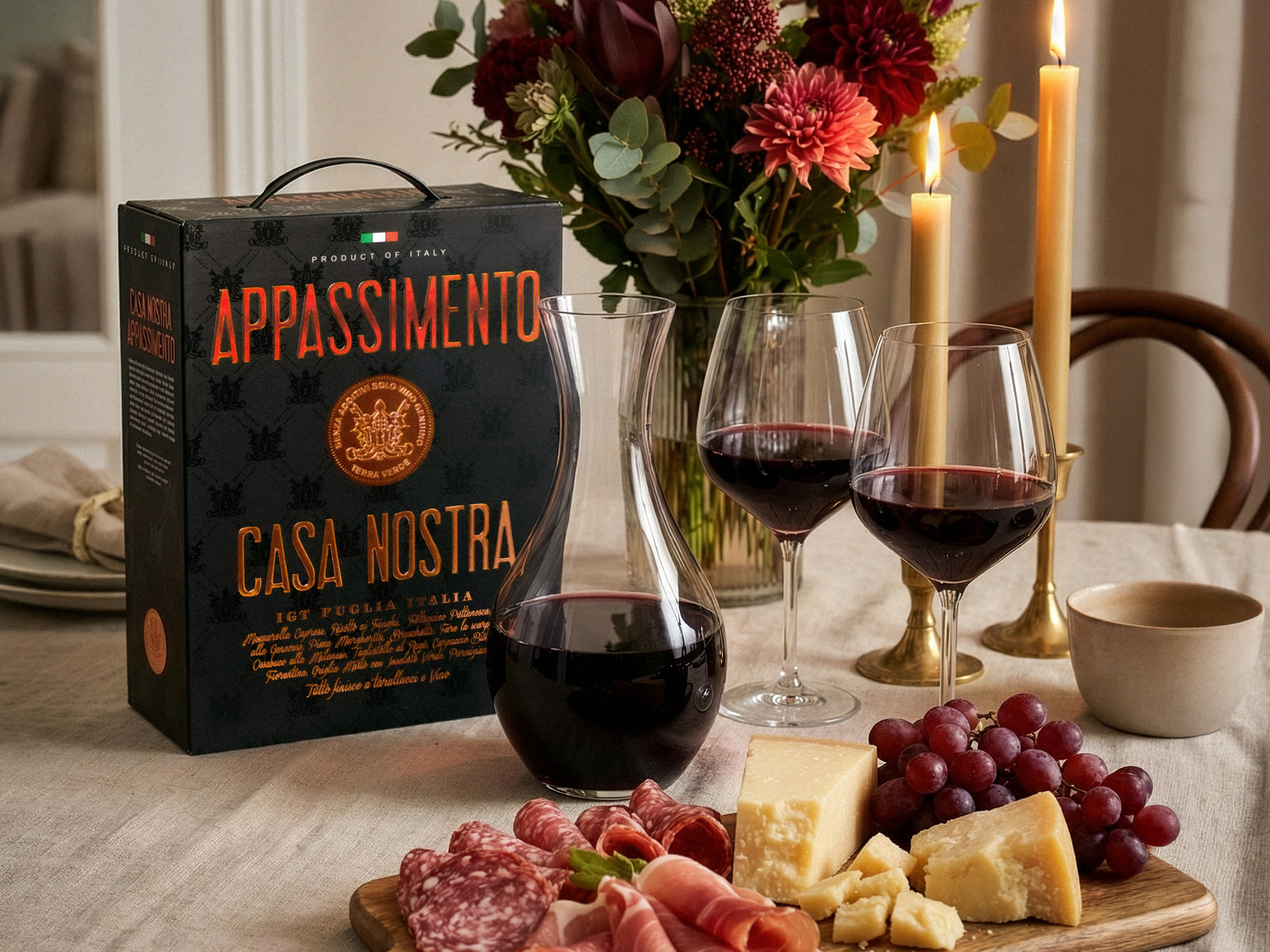 Casa Nostra Appassimento är ett fylligt och smakrikt rött vin på box från soliga Apulien i södra Italien. Här möts traditionellt hantverk och modern tillgänglighet i ett vin som bjuder på generös frukt, mjuk struktur och tydlig italiensk värme.