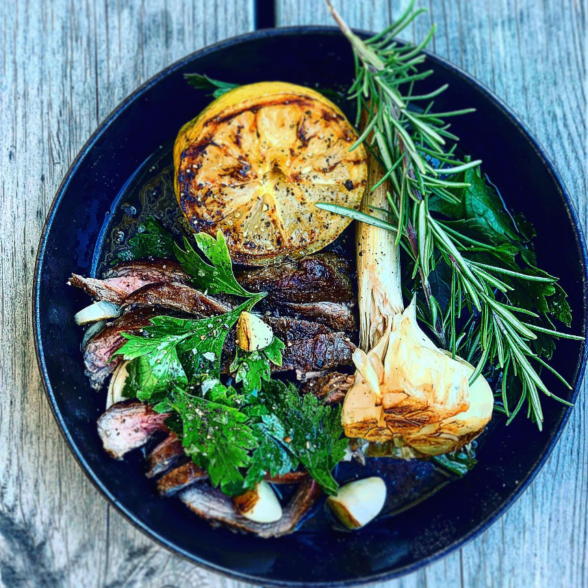 Finhacka rosmarinen, riv vitlöken och pressa i citronsaften. Tillsätt olivoljan och rör om. Gnid in köttet med salt och nymald svartpeppar från kvarnen. Bryn köttet runtom i smör & olivolja i en stekpanna. Krydda med salt och nymald svartpeppar igen. Tag bort köttet från värmen och gnid in det med vitlök & rosmarinblandningen. Lägg köttet i en ugnsform och ställ in i ugnen på 150 grader. Lammet ska ha en innertemperatur mellan 50 – 60 grader beroende på hur rosa man vill ha det. Ta ut det från ugnen och linda in lammet i aluminiumfolie & låt vila i ca 10 minuter. Skär upp köttet, servera med potatis, chimichurri och sallad.